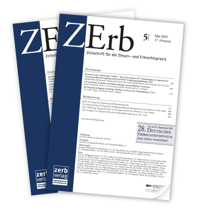 Die Zeitschrift für die Steuer- und Erbrechtspraxis ZErb ist die Namensgeberin des zerb verlages. Seit 1999 erscheint sie auch als Mitgliederzeitschrift der Deutschen Vereinigung für Erbrecht und Vermögensnachfolge (DVEV e.V.). Mit einer monatlichen Auflage von 3.000 Exemplaren ist sie mittlerweile die auflagenstärkste Fachzeitschrift zum Erbrecht. Jeden Monat neu: alle Facetten des Erbrechts Monatlich gibt die ZErb mit Rechtsprechungsreport, Praxisforum, Literaturecke, Musterformularen für die Praxis, Gestaltungshinweisen und Checklisten die notwendigen Informationen über aktuelle erbrechtliche Entwicklungen. Die Schriftleitung der ZErb hat Herr Rechtsanwalt und Notar Dr. Pierre Plottek, Bochum, inne. Sie erreichen Herrn Dr. Plottek unter schriftleitung@zerb.de Weitere Informationen finden Sie unter: drplottek.de/schriftleitung-zerb Die Herausgeber sind erfahrene Praktiker und bekannte Autoren: Rechtsanwalt Raymond Halaczinsky, Ministerialrat a.D., Bonn Rechtsanwalt und FAStR Dr. Marc Jülicher, Düsseldorf PD Dr. Olaf Meyer, Würzburg Rechtsanwalt, FAStR und Stb Dr. Christopher Riedel, LL.M., Düsseldorf und Notar Dr. Thomas Wachter, München Testabo Wünschen Sie ein Testabo? Bestellen Sie 3 Hefte für nur 30,00 € (inkl. 5,00 € Versandkosten). Nach Ablauf des Testabos erfolgt keine weitere Belieferung! Jahresabo Die ZErb erscheint in zwölf Ausgaben jeweils zum 10. des Monats. Der Brutto-Bezugspreis liegt bei 286,92 € (zzgl. 2,00 € Versandkosten pro Heft). Für Mitglieder der Deutschen Vereinigung für Erbrecht und Vermögensnachfolge e.V. ist der Bezug des Heftes bereits im Mitgliedsbeitrag enthalten. Der Preis für ein Einzelheft beträgt 19,90 € (zzgl. 1,95 € Versandkosten). Einbanddecke Lassen Sie sich die einzelnen Jahrgänge der ZErb durch Ihren Buchbinder binden. Der Preis für eine Einbanddecke beträgt 15,50 €, zzgl. Versandkosten. Index Der Index zum Vorjahr liegt jeweils dem Februar-Heft bei.